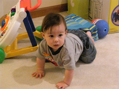 At one year, you weigh around 25 lbs and are 32 inches tall. This past month you have grown and changed so much! You are now taking steps! You can push up to standing without holding on to anything. Then you take about 8-10 steps before falling over. You walk back and forth between mommy and daddy and the furniture all the time. You are now eating so many more foods! You love bananas and Cheerios. You like macaroni and cheese and you love spaghetti! Mama is just feeding you whatever we have for dinner. You even like tacos! You hardly have baby food anymore. You are getting so big! You still babble to us all the time. You love to say mama and dada and walk towards us. Daddy loves coming home from work because you are so happy to see him. You giggle and race over to see him. You are sleeping a little better, but I still think that we have some improvement to make in that area! You love going for walks in our new carrier. You love just riding on mama's back and looking around. You seem so peaceful back there. You are still nursing all the time. We have been nursing for a year!! Such a huge milestone for mama and you. Your first birthday party is this Saturday! Lots of friends and family are coming. We are very excited! We are also getting family pictures taken on Sunday. Can't wait to get those!